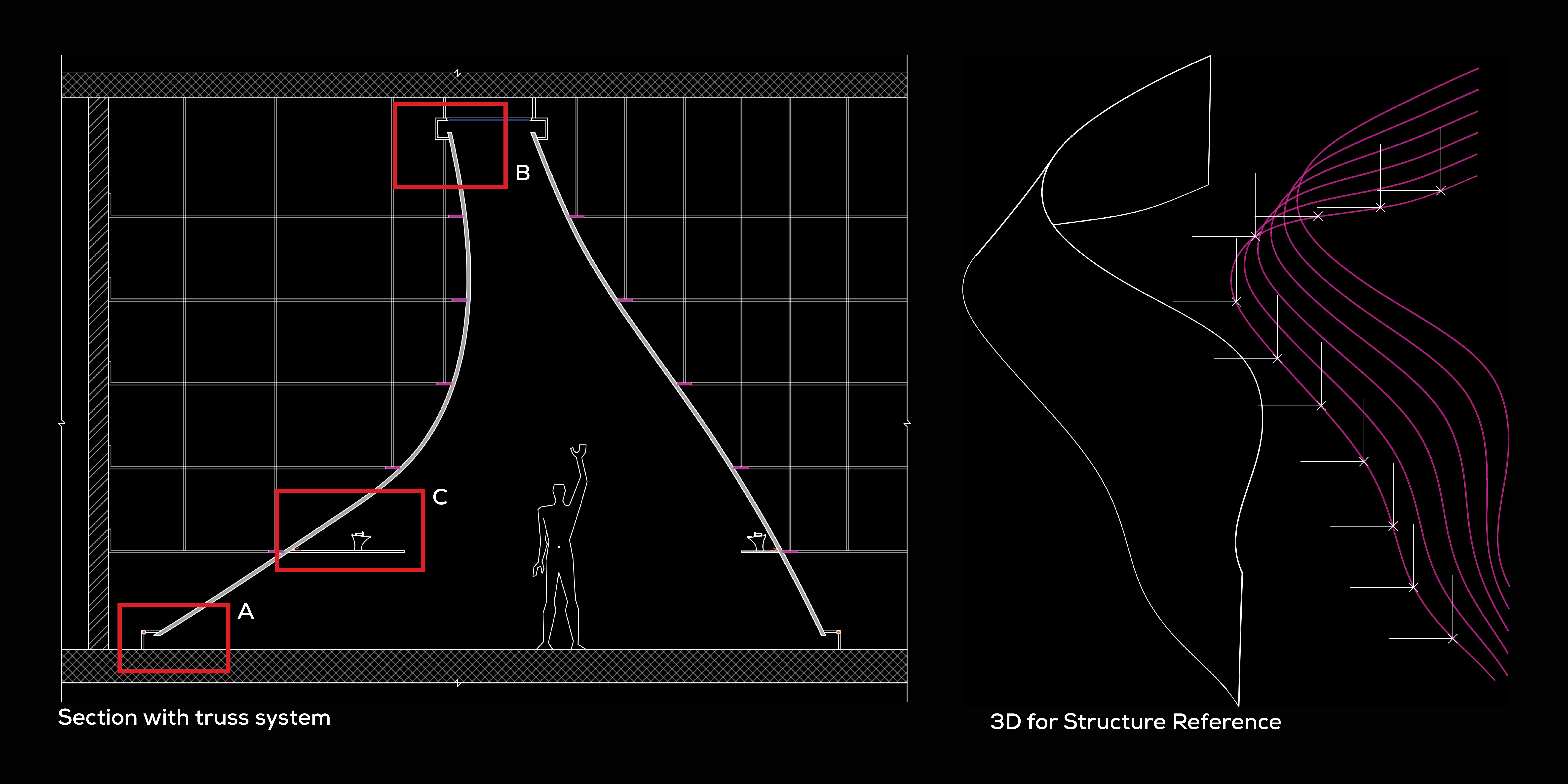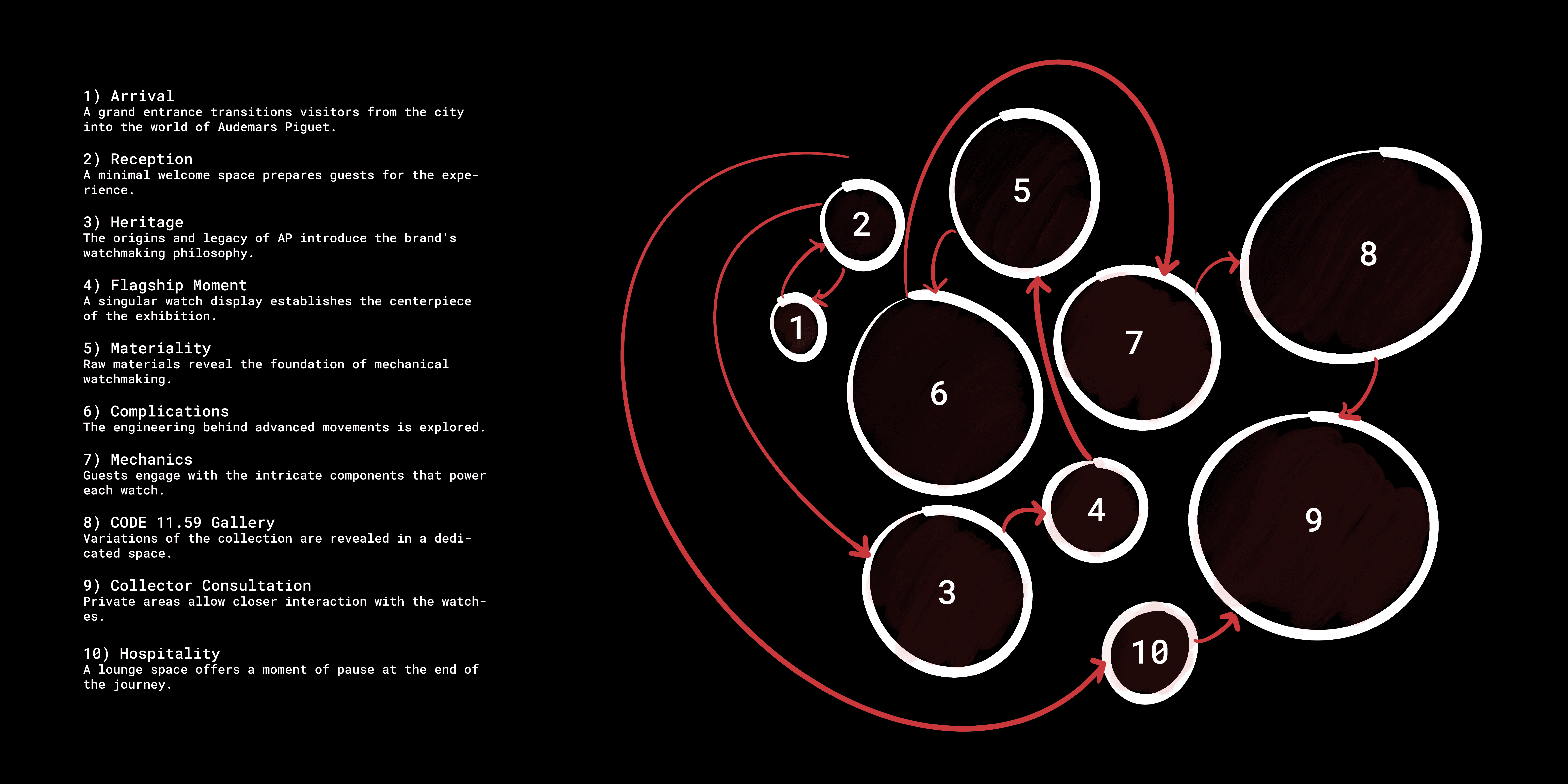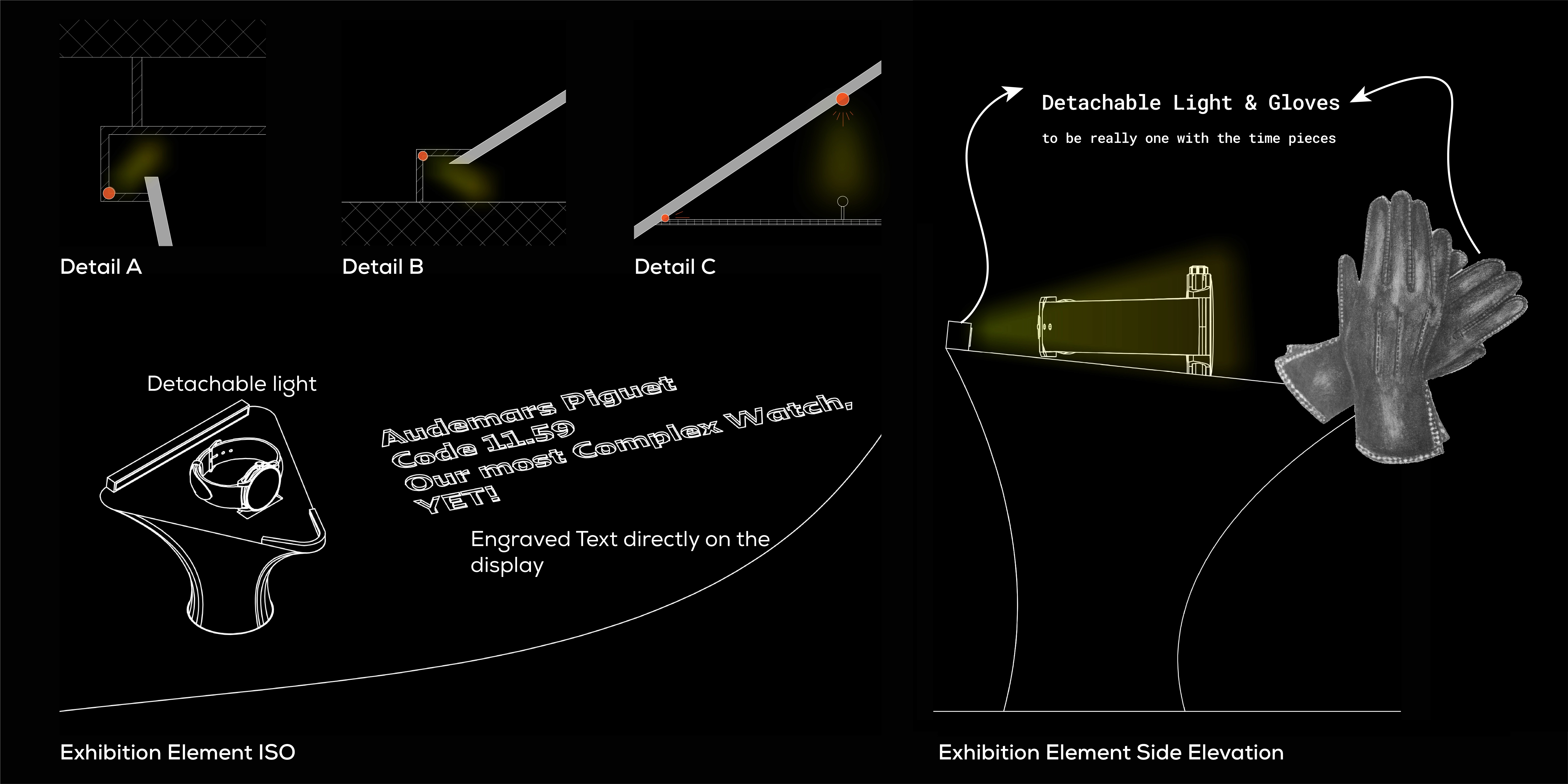 The schematic plan below illustrates the final activation, designed to evoke a dim, mysterious, and exclusive atmosphere that reflects the essence of Audemars Piguet. Created for a niche audience, every detail is meticulously considered, embodying the brand’s spirit of innovation beyond the timepieces themselves. The goal is to leave visitors in awe of the brand’s craft and legacy, positioning the activation not just as an exhibition, but as a work of art. The images under the plan represent the final mood board and a stage 1 render.