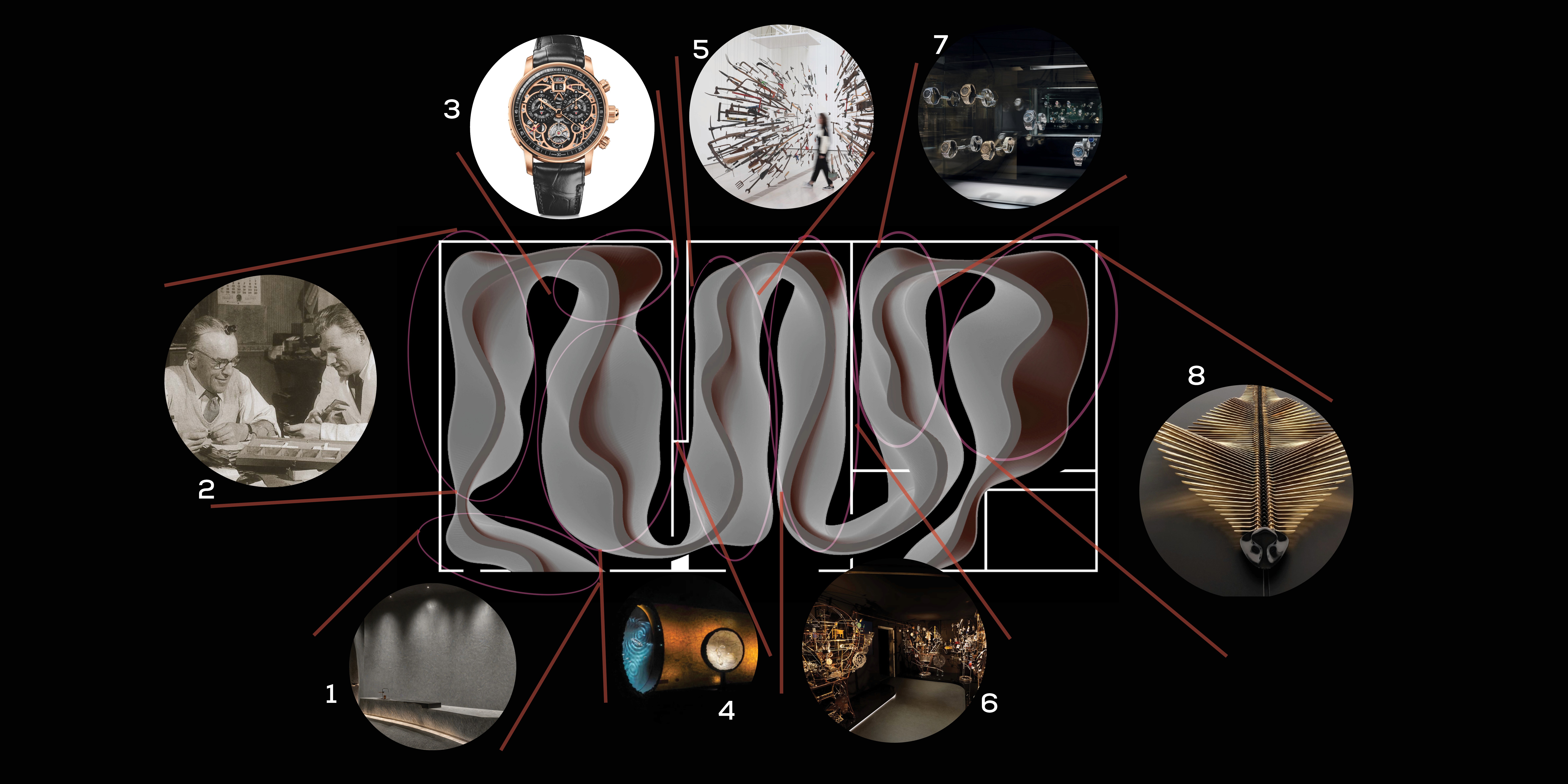 A Landscape of Code 11.59 Timepiece: The spatial language is derived from the flowing form of the Vallée de Joux river. These organic geometries create a continuous sequence of rooms that guide visitors through the narrative of watchmaking.