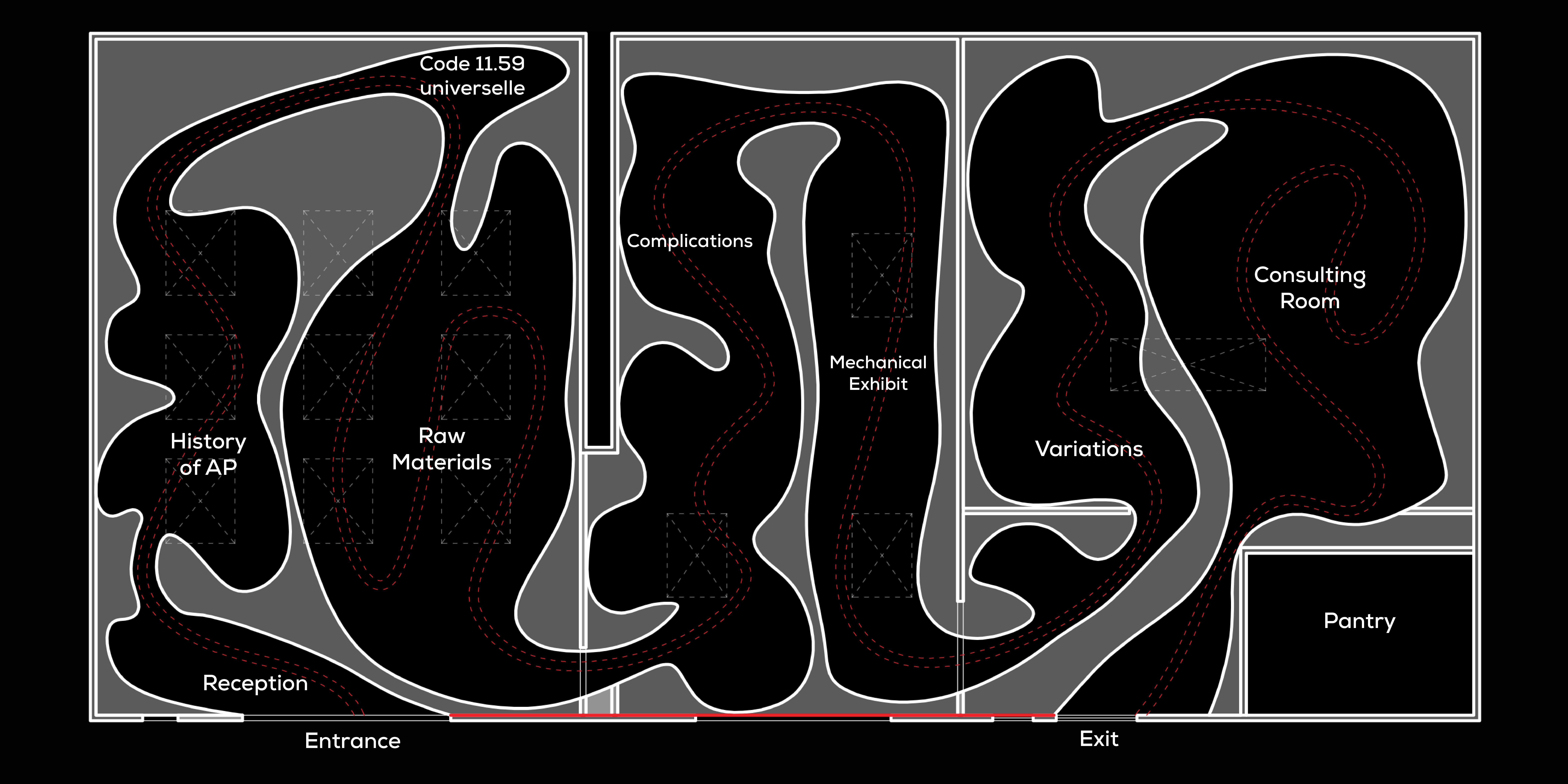 Guests are guided through a sequence of spaces that gradually reveal the craft behind Audemars Piguet watches. The journey moves from brand heritage and materials to the intricate mechanics of watchmaking, culminating in an intimate encounter with the CODE 11.59 collection.