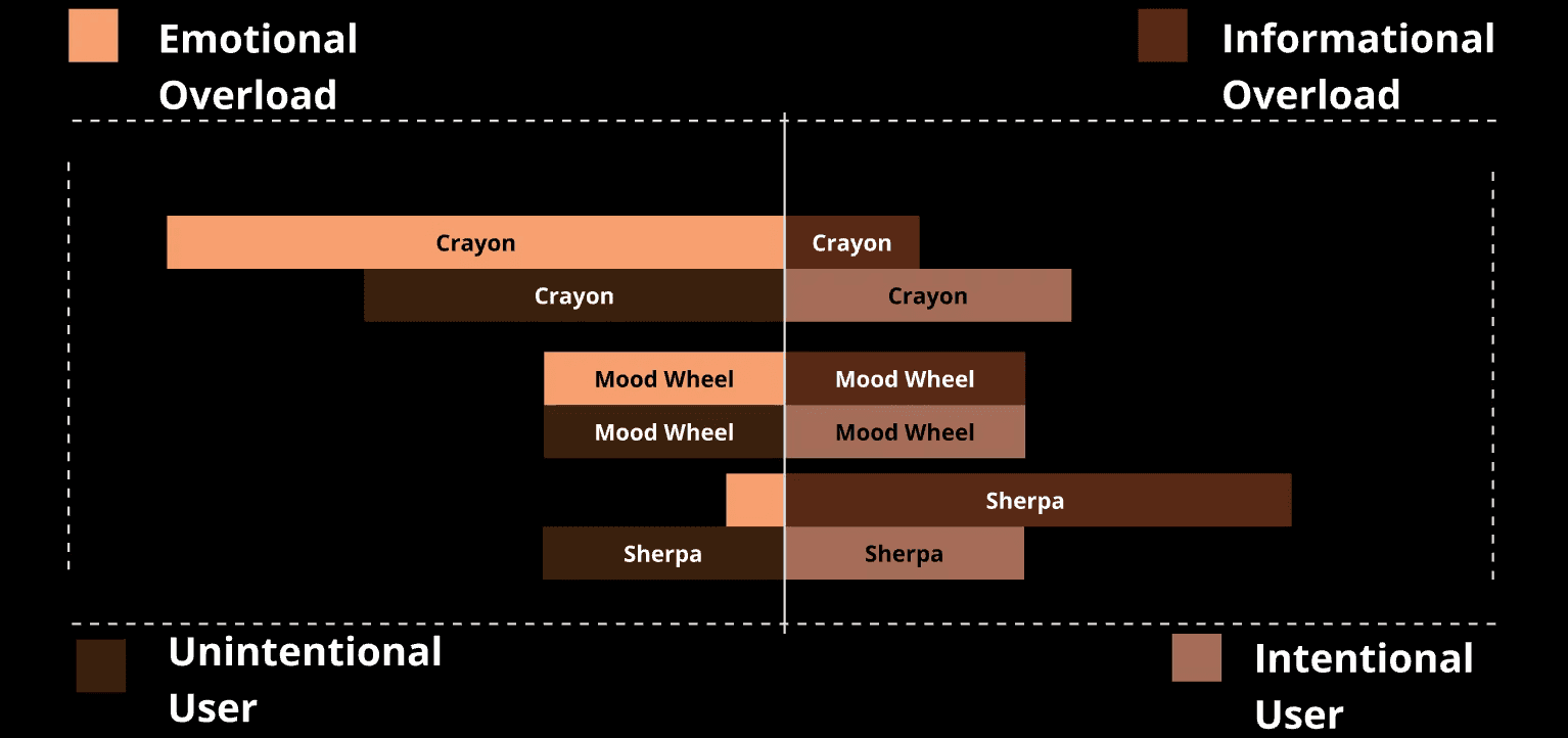 Through prototyping, three distinct service directions emerged, each addressing a unique challenge: information overload, emotional overwhelm, and a balance of both. These services were tailored to two user groups: Intentional and Unintentional Users. This led to the development of Sherpa, Crayon, and MoodWheel - three prototypes positioned across a spectrum of needs and behaviors, as illustrated in the diagram below.