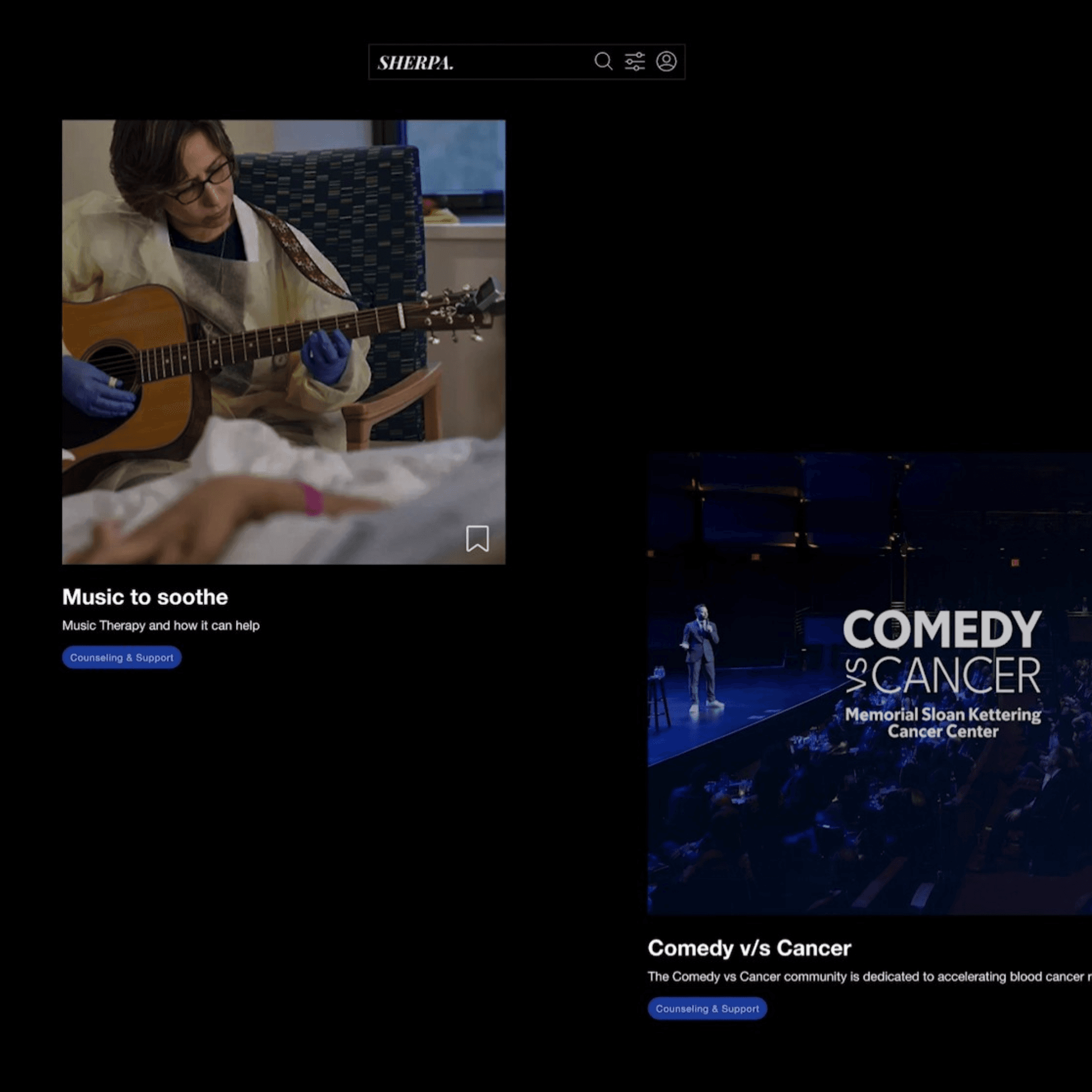 Sherpa is a digital guide that highlights non-clinical MSK services, helping cancer patients navigate support beyond treatment. It addresses information overload by curating only trusted, relevant MSK resources, presented through a simplified, visually-driven interface. With features like predictable themes, tag-based searching, and clear navigation, Sherpa ensures patients receive personalized, digestible information, making it easier to explore, learn, and access the right help at the right time.