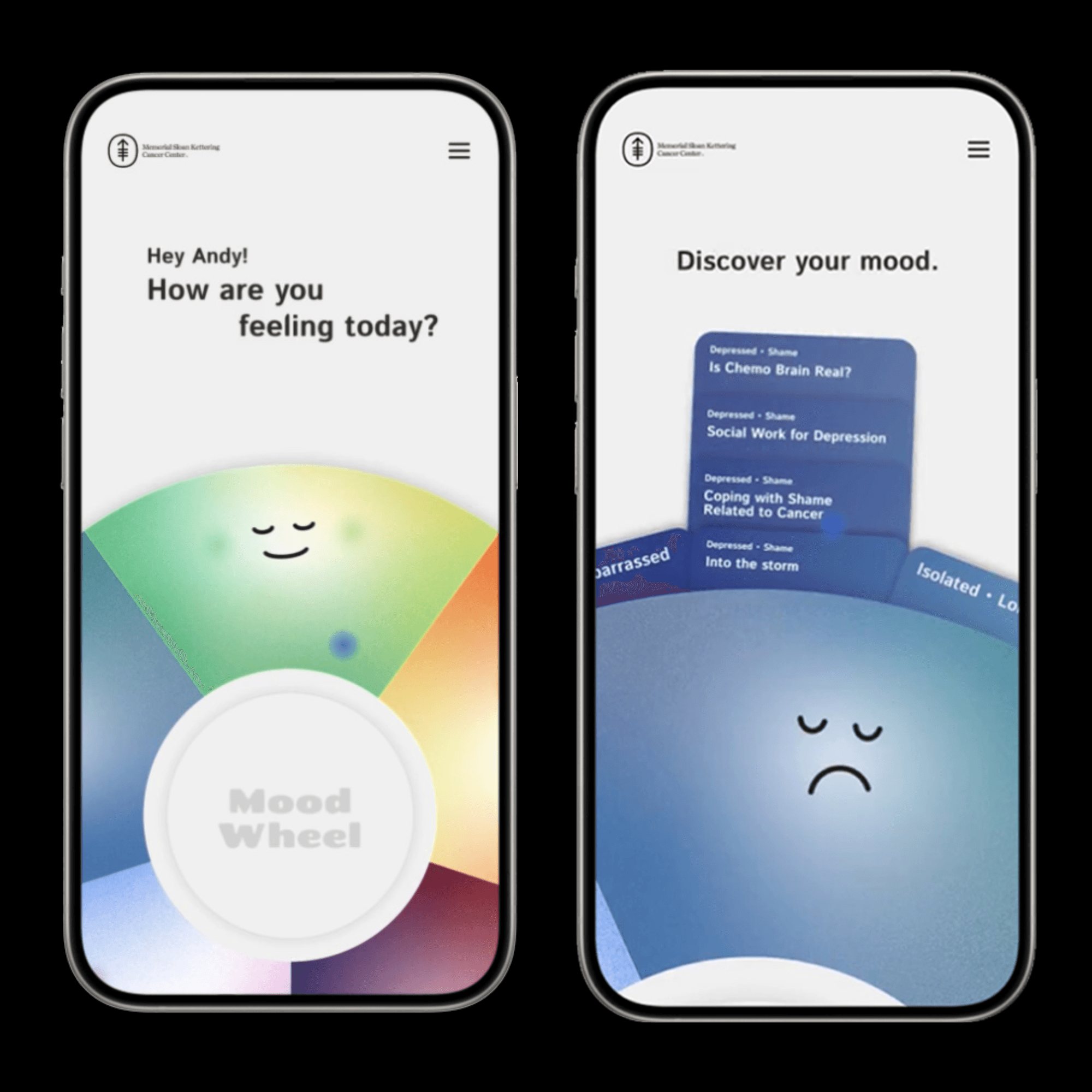 Mood Wheel is a personalized emotional support tool designed to help cancer patients process the ups and downs of their diagnosis. By logging emotions on a gamified mood interface, patients receive tailored MSK resource recommendations. Its key features include a mood tracker, smart resource lists, and an emotional journey log. Mood Wheel reduces emotional overload and supports more personalized, holistic care through ongoing mood tracking and pattern recognition.