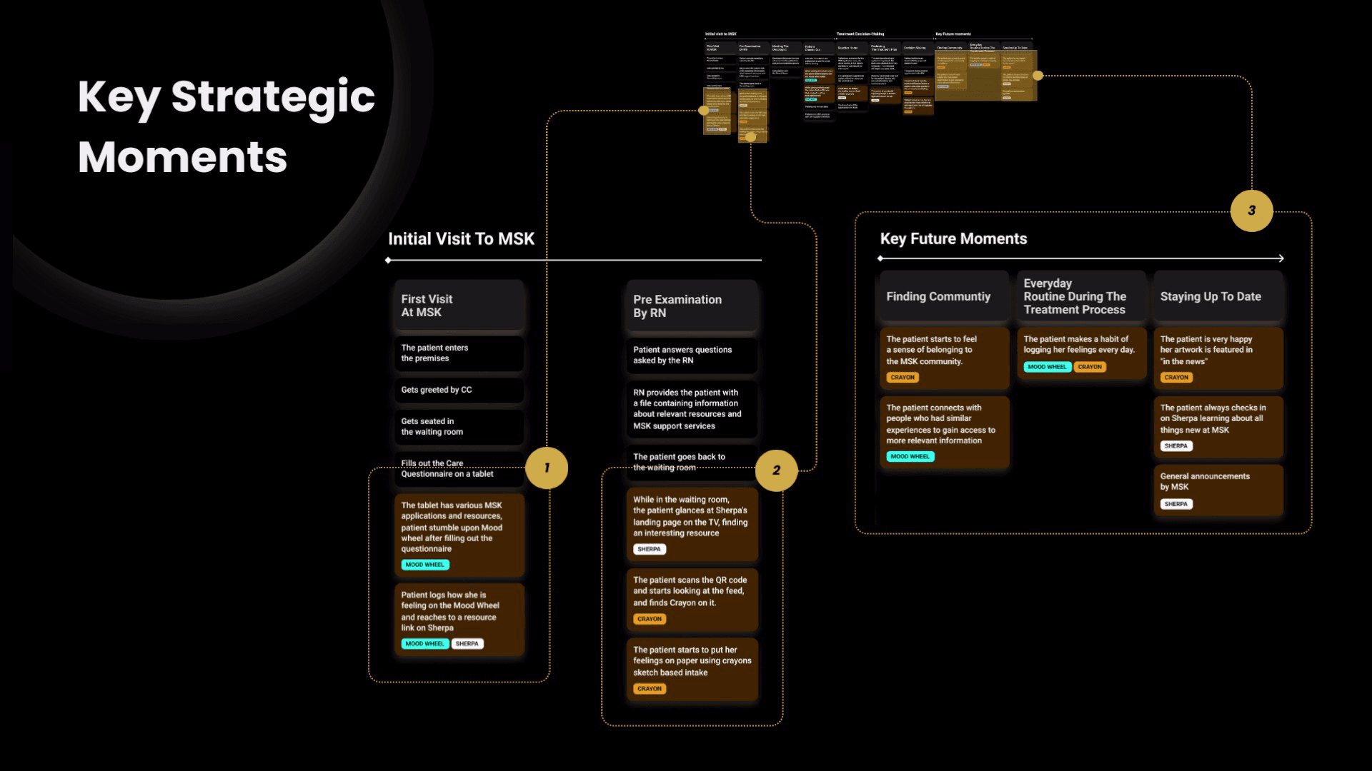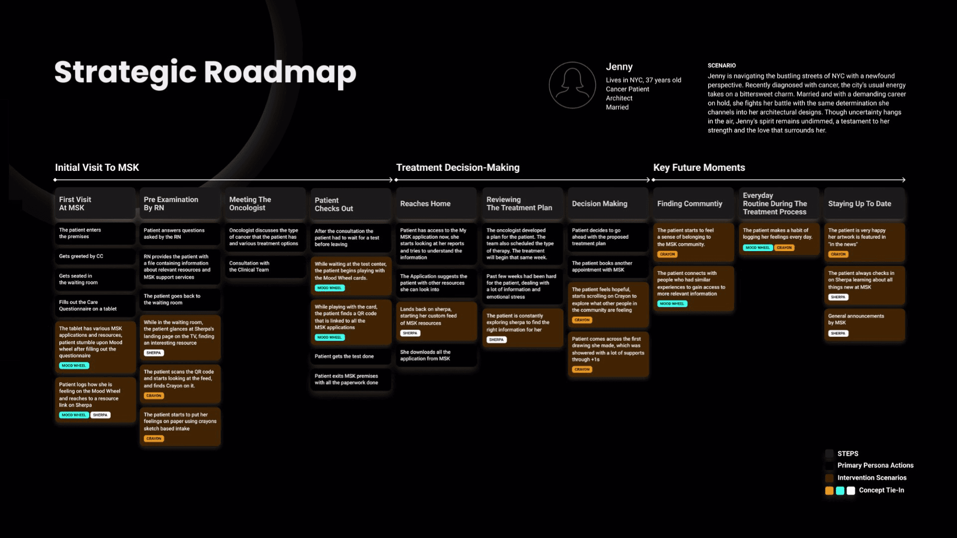 Patients at Memorial Sloan Kettering face a dual burden as they process complex clinical information while coping with the emotional shock of a cancer diagnosis. Despite the wealth of nonclinical resources available, patients often struggle to access or absorb them without feeling overwhelmed. The challenge was to identify points of friction, emotional vulnerability, and cognitive overload and to explore how design could offer meaningful, yet simple and easy solutions within these critical moments.
